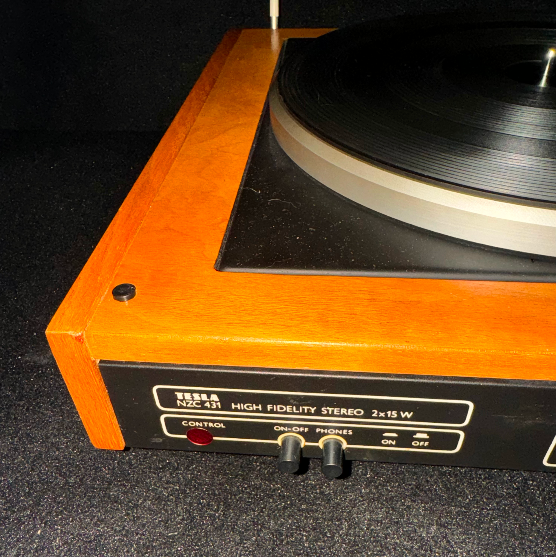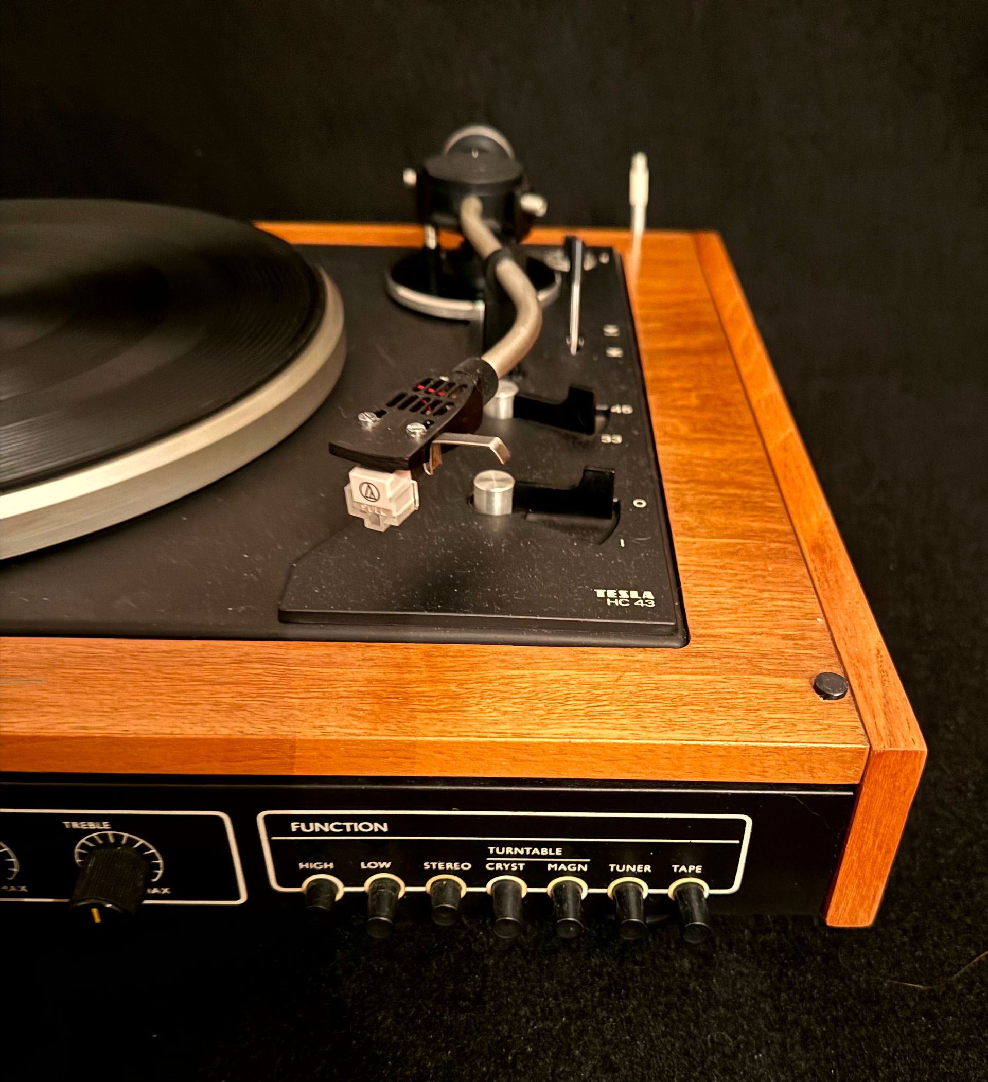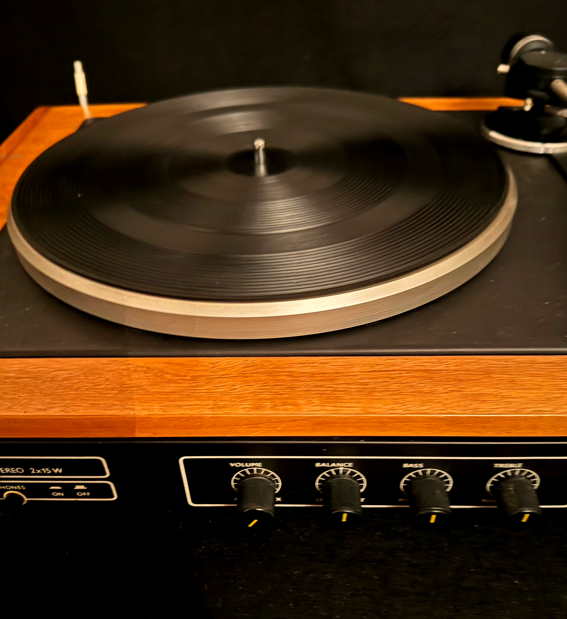 ZÁKLADNÍ PARAMETRY – tmavé provedení dýhy - nová dýha 33 a 45 otáček, nová magnetodynamická přenoska, řemínkový náhon, vyvážení ramínka, antiskating, koncové vypínání, zesilovač 2x15W/4ohm,vstupy pětikolík tuner, tape(CD)filtry high, low, výstup pro sluchátka, nový kryt. Celý gramofon včetně zesilovače je po důkladné repasi.