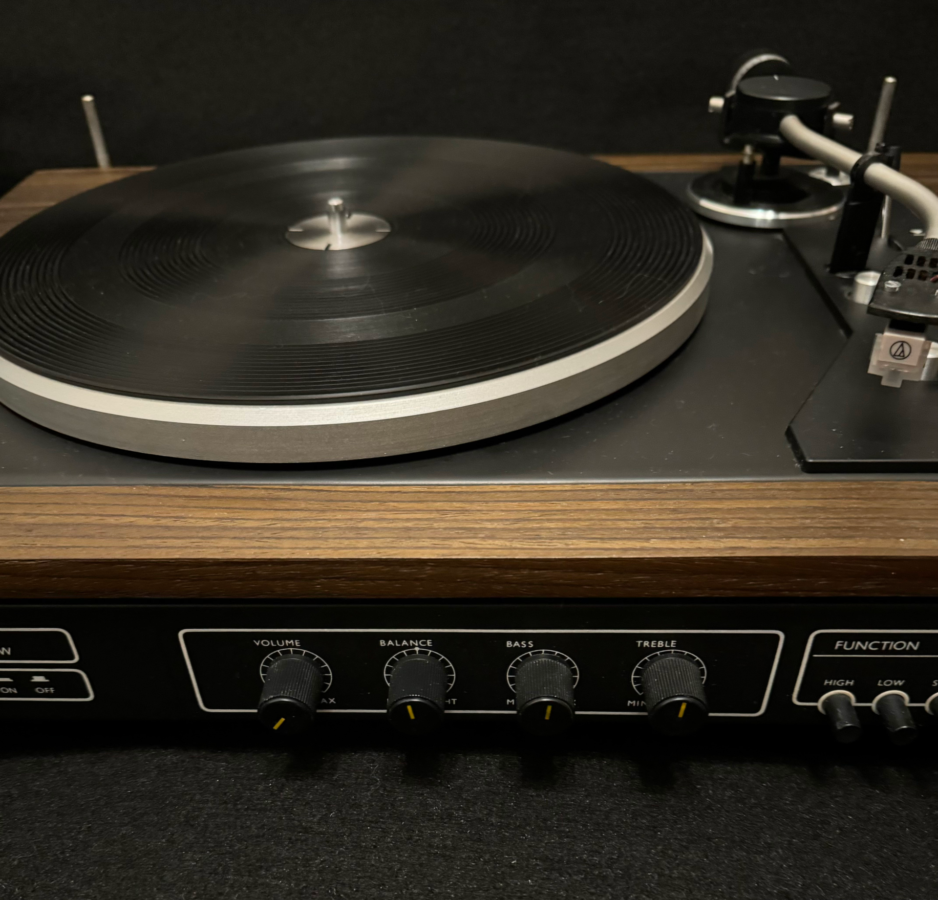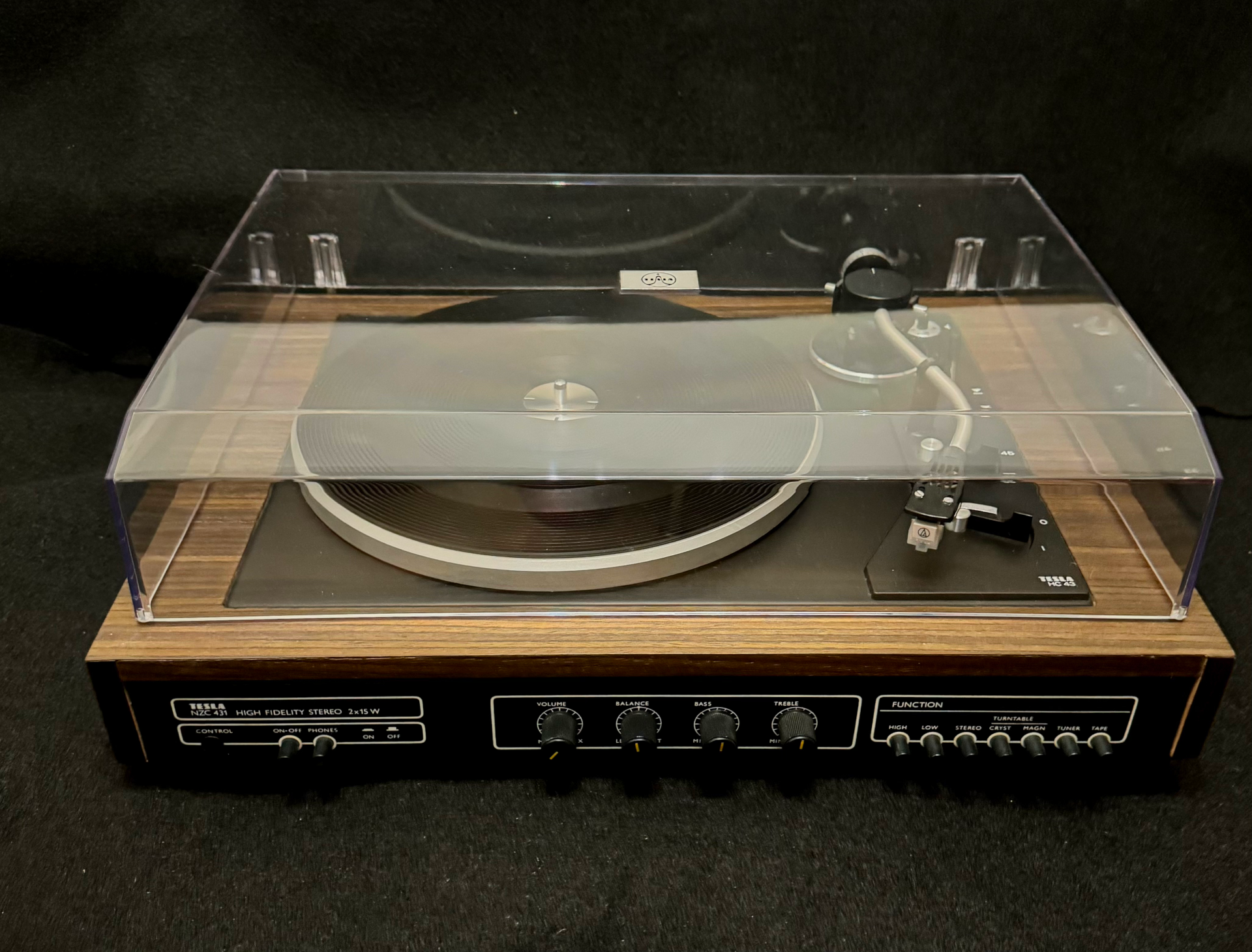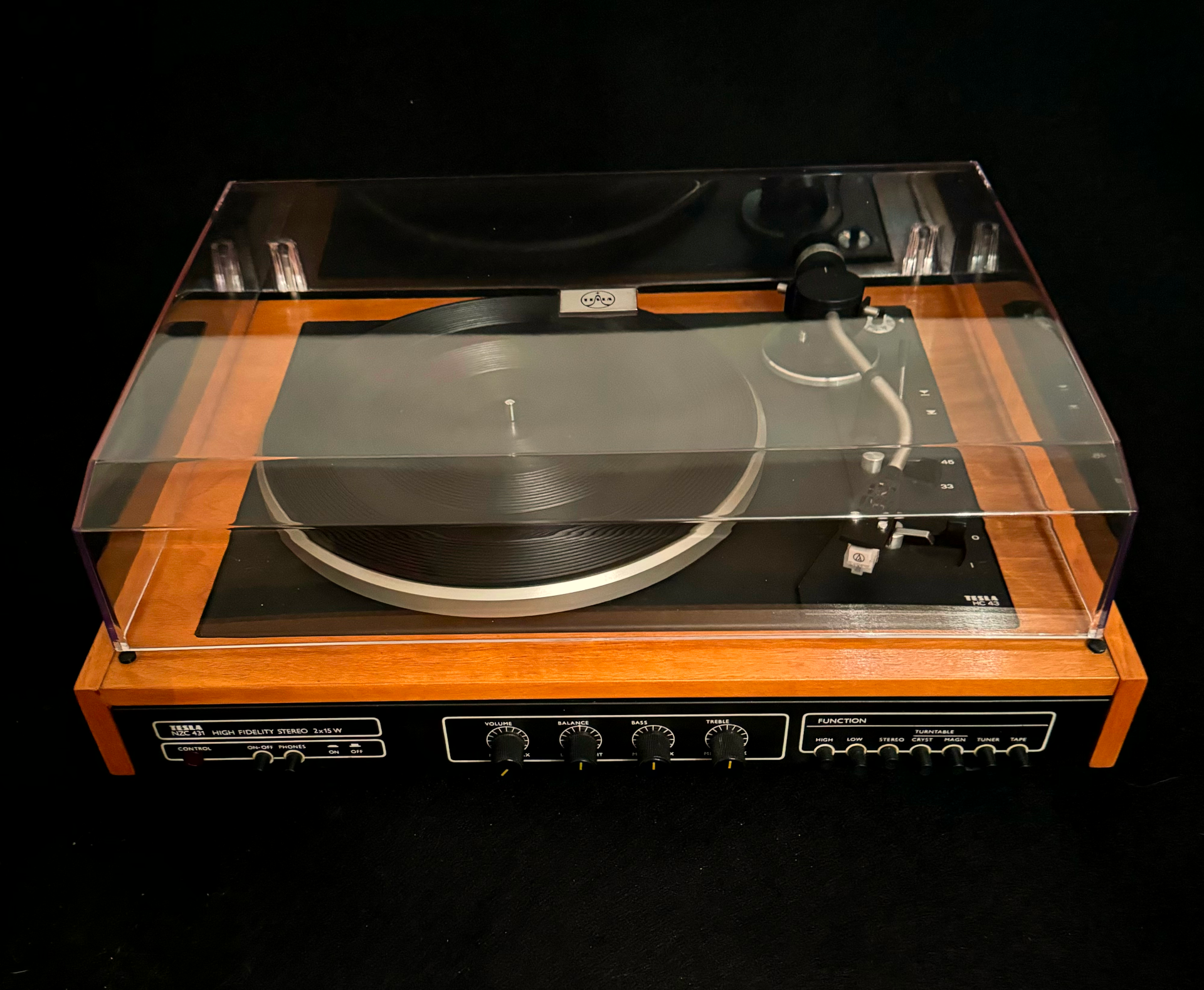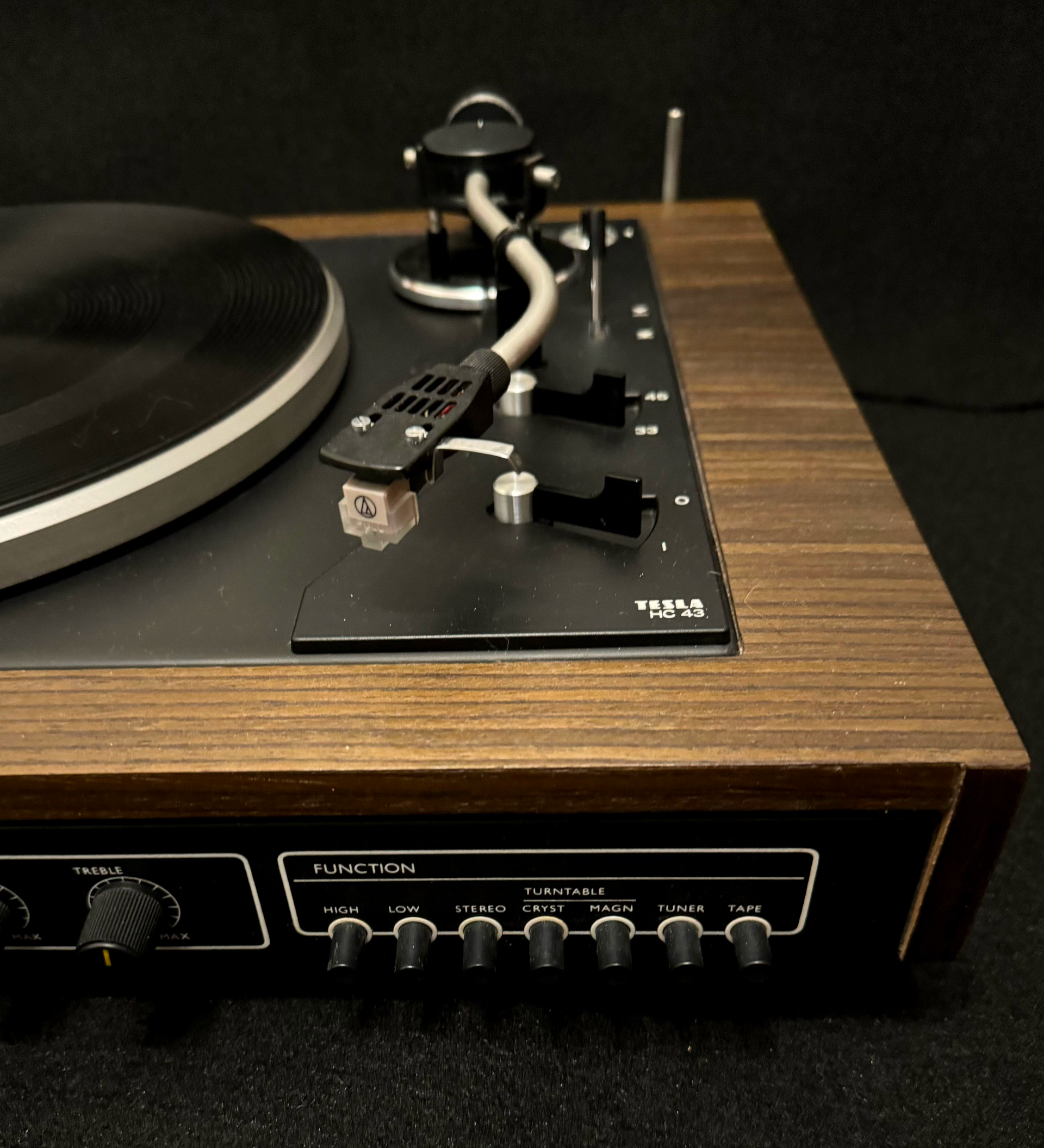 ZÁKLADNÍ PARAMETRY – tmavé provedení dýhy - nová dýha 33 a 45 otáček, nová magnetodynamická přenoska, řemínkový náhon, vyvážení ramínka, antiskating, koncové vypínání, zesilovač 2x15W/4ohm,vstupy pětikolík tuner, tape(CD)filtry high, low, výstup pro sluchátka, nový kryt. Celý gramofon včetně zesilovače je po důkladné repasi.